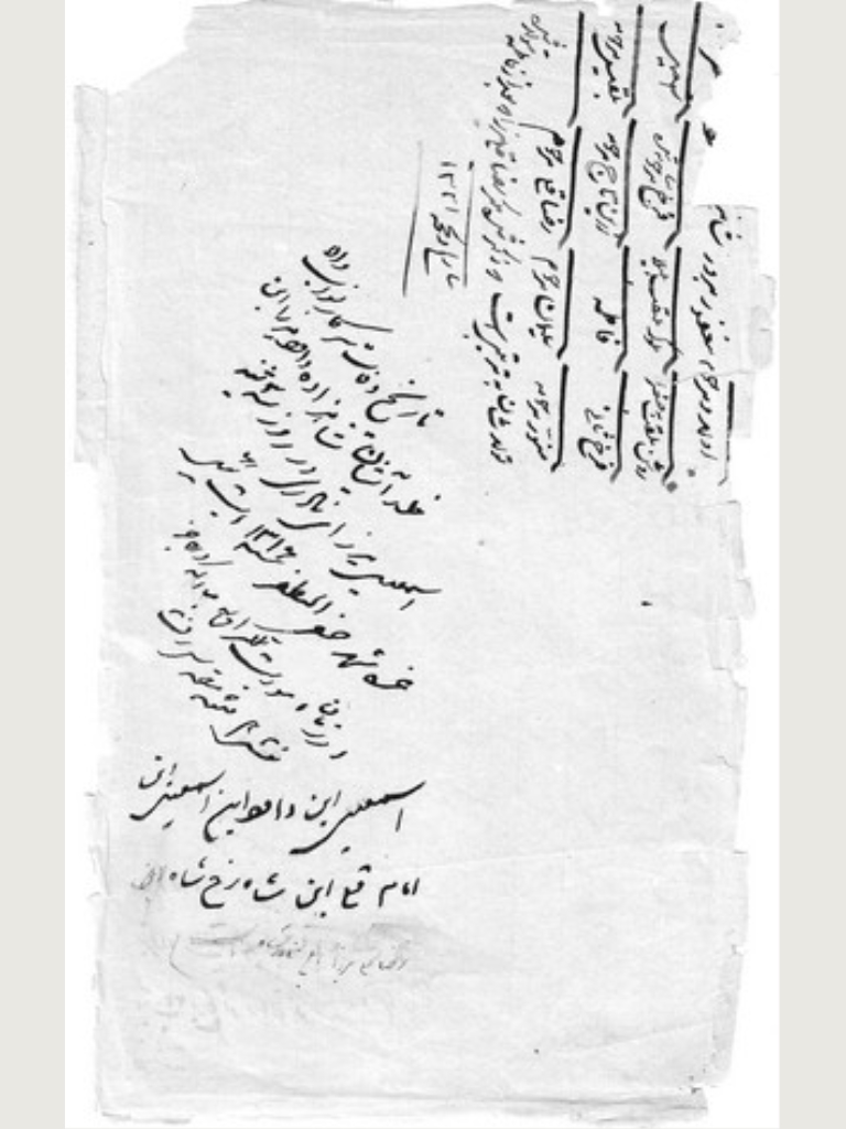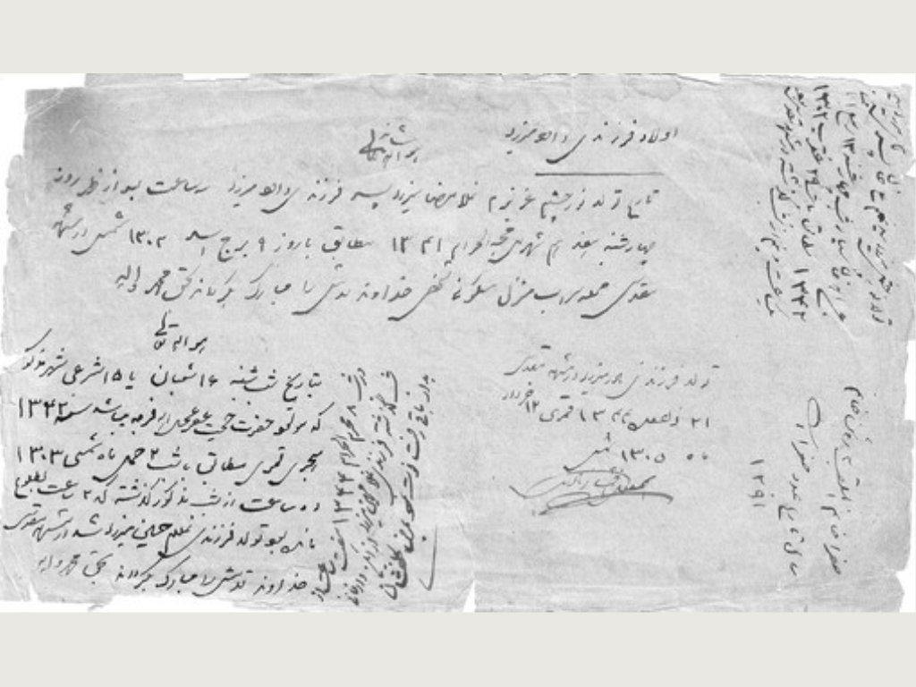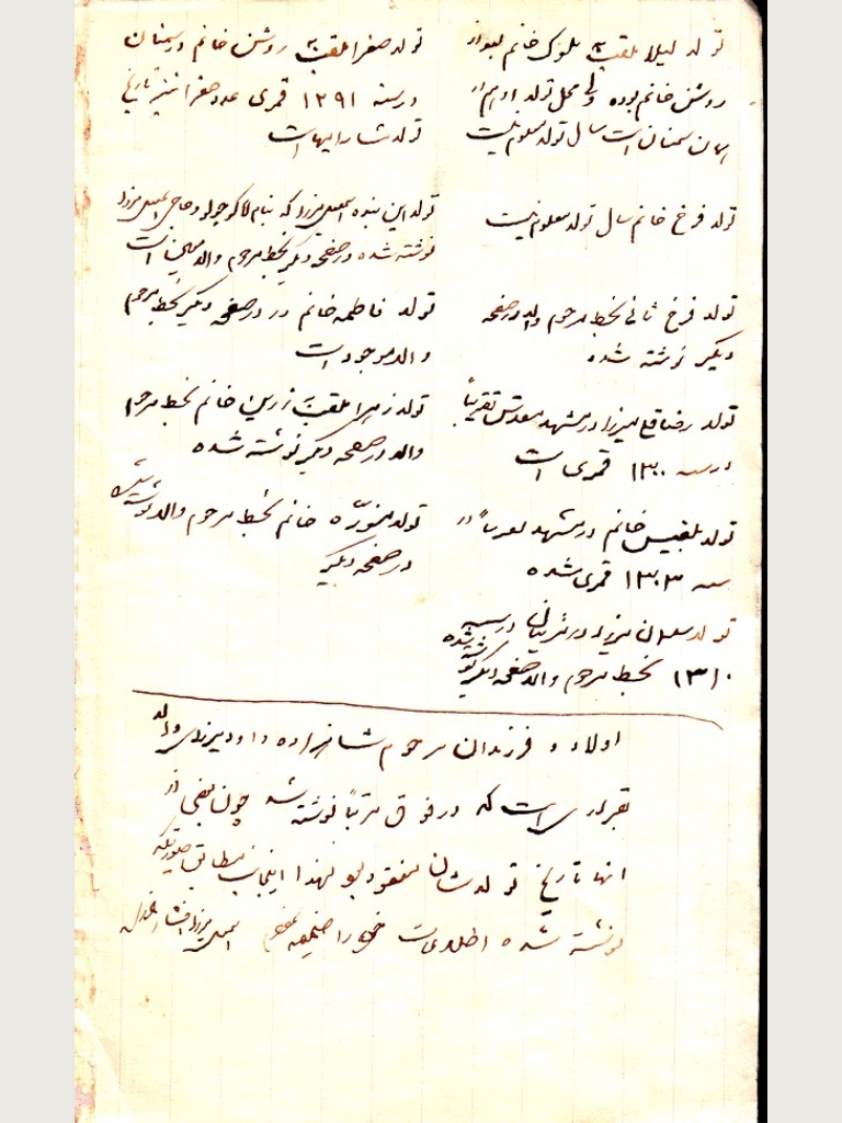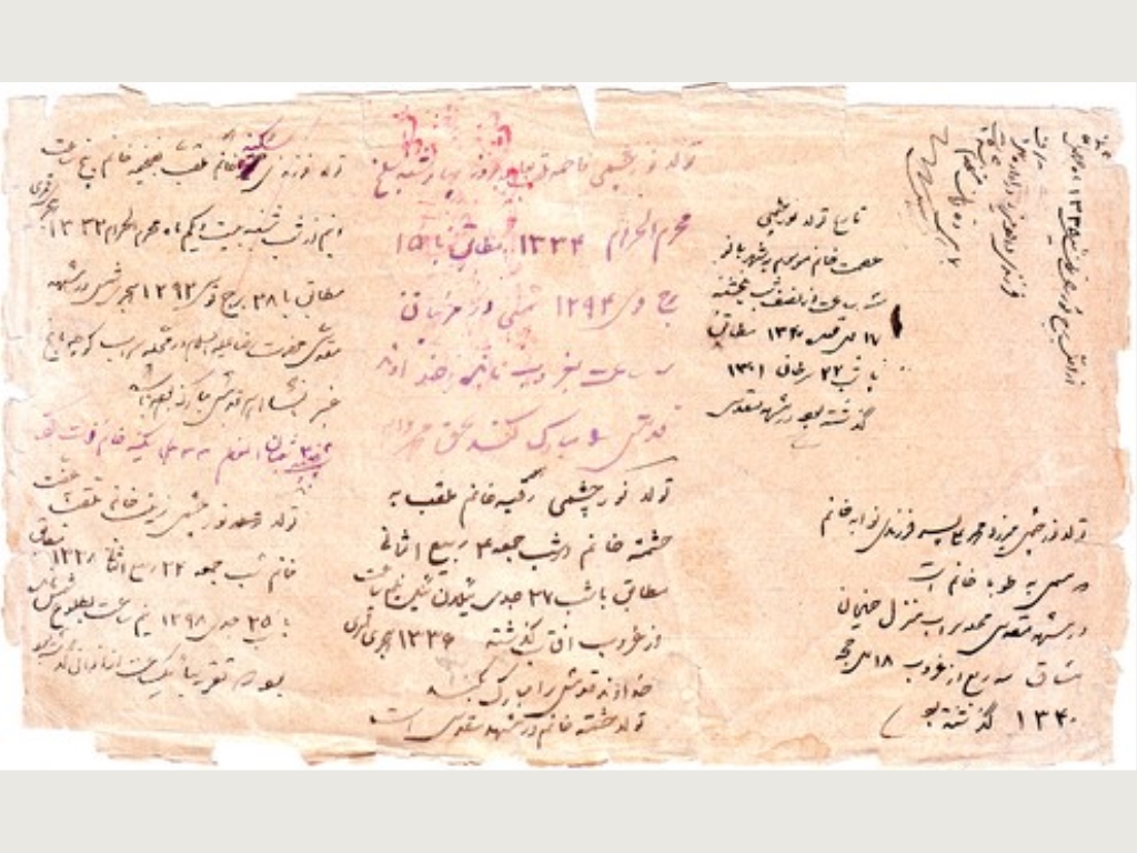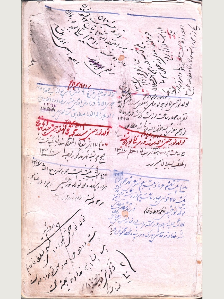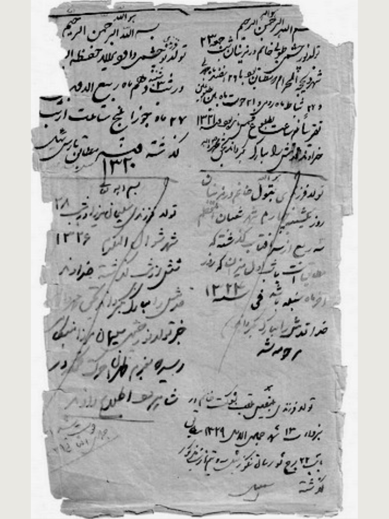تصاویری از صفحات پشت جلد یک کتاب قدیمی که اسماعیل میرزا - و قبل از او پدرش داود میرزای اول (سرهنگ) – تاریخ تولد فرزندان خود را با دستخط خود بر آن ها ثبت می کردند.